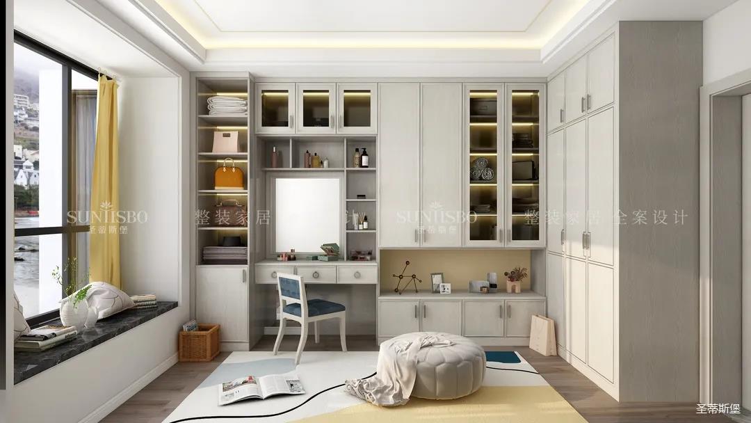 衣帽间是女主特别要求的,设计是将房间打造成衣帽间系统,采用L型布局,壁挂式设计,让穿搭动线更顺畅,视觉上也更通透,可直观的展示女主人穿搭品味。玻璃层板与背板花色的结合,精致灵动,成为时尚与轻奢的写照,封闭区衣柜的合理格局规划,完美诠释现代轻奢风于当代定制中的前瞻性。